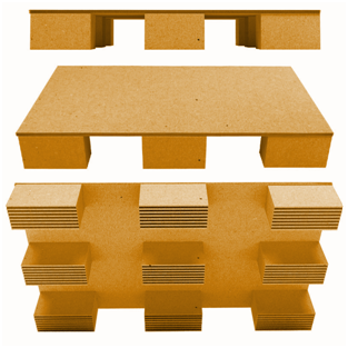Картонные поддоны изготавливаются из прочного многослойного листового гофрокартона. Они состоят из основания и приклеенных специальным составом ножек. В зависимости от выбранного сырья такие паллеты способны выдерживать нагрузки до 1500 кг. К другим их плюсам стоит отнести: